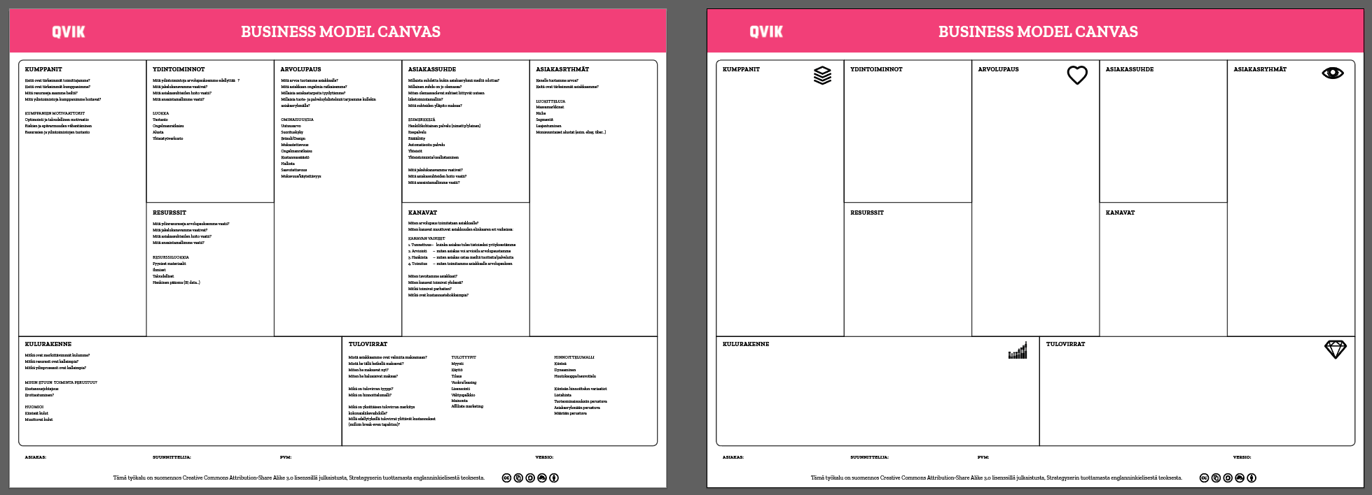 Käänsin itse työkalun suomeksi Juha Tuulaniemen innoittamana vuonna 2015. Tuulaniemi oli tehnyt Palvelumuotoilu -kirjaansa varten työkalusta variaation, josta halusin tehdä vielä saavutettavamman. Nimellä SC5 Business Model Canvas (https://sc5.io/posts/business-model-canvas-suomeksi/) ilmestynyt sähköinen työkalu alkuperäisellä lisenssillä oli vuosia edellisillä verkkosivuilta saatavissa vapaasti ja sitä ladattiin vuosien varrella kymmeniä tuhansia kertoja. Yrityksen fuusioituessa käännös hävisi kuitenkin verkosta pysyvästi. Näin tuli aika uudelleen julkaisun, joka tulee tässä: