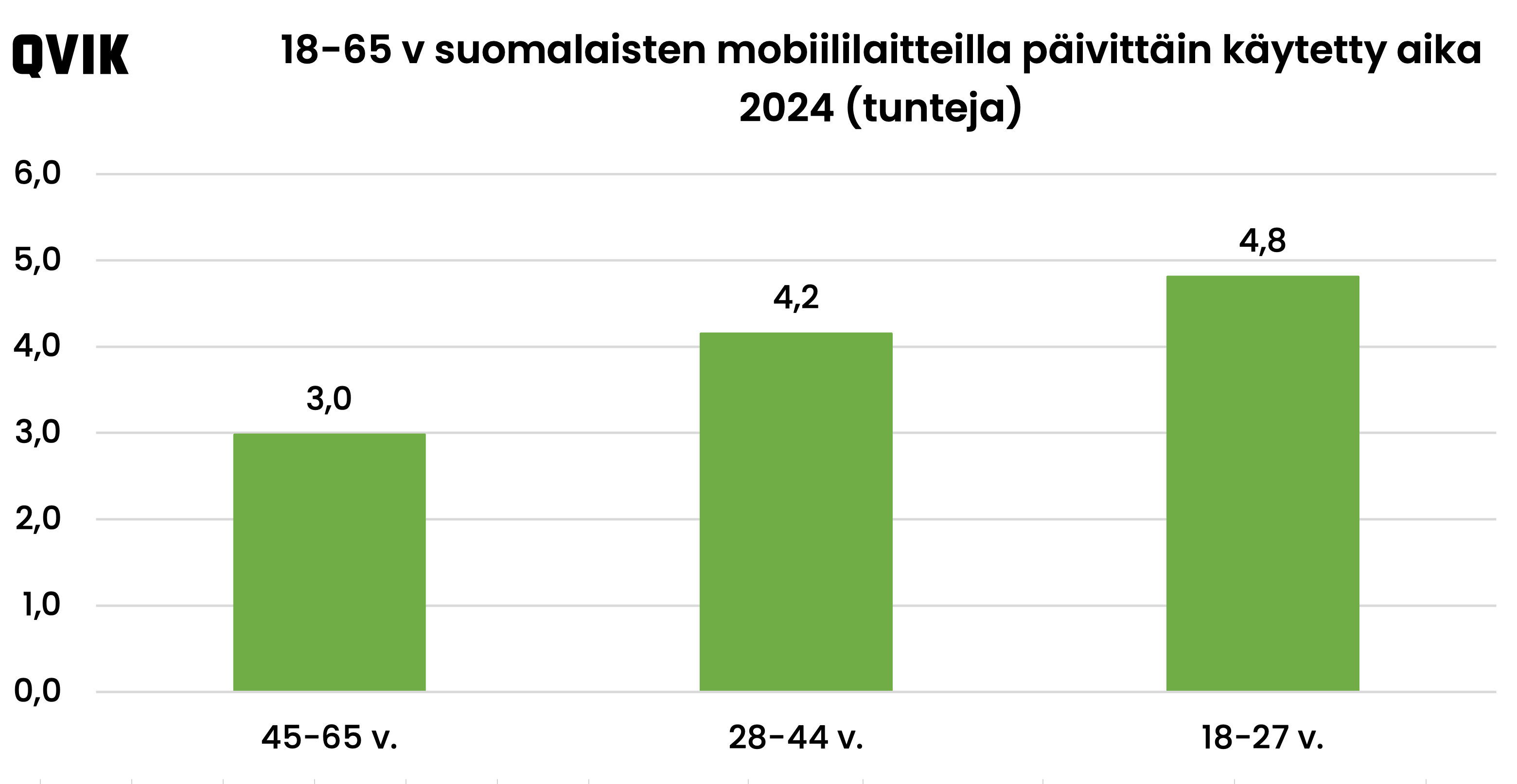 Vastaajien itseraportoitu aika kännykällä yltää keskiarvoisesti lähes neljään tuntiin vuonna 2024. Qvikin edellisvuosien tutkimuksista ruutuaika on kasvanut muutaman prosentin verran.