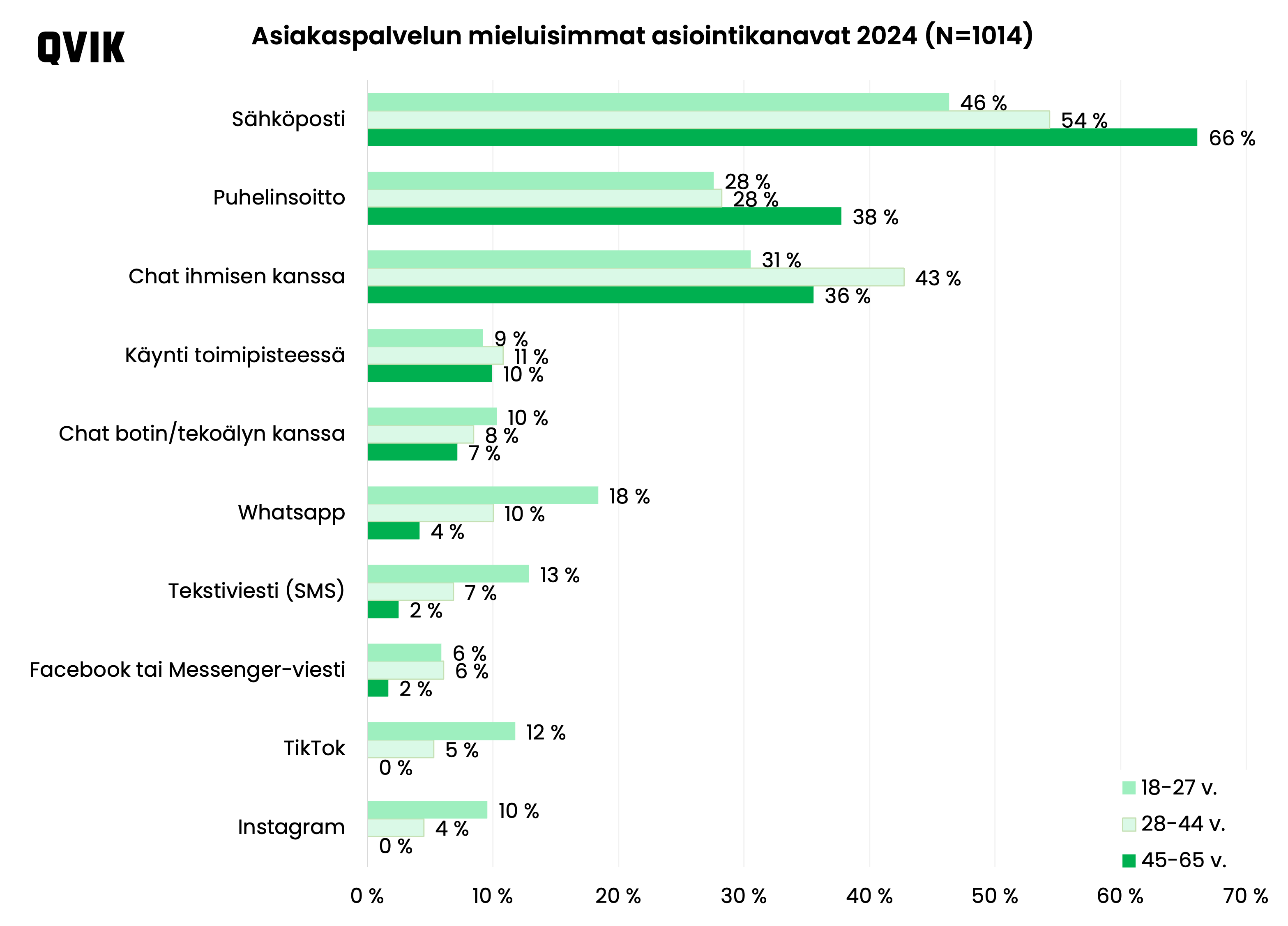 Vaikka ikäryhmien välillä on selviä eroja sähköpostin suhteellisessa suosiossa, on se kaiken ikäisten ykkösvaihtoehto. Kakkoseksi tulee yli 44-vuotiailla puhelinpalvelu, nuoremmilla chat.