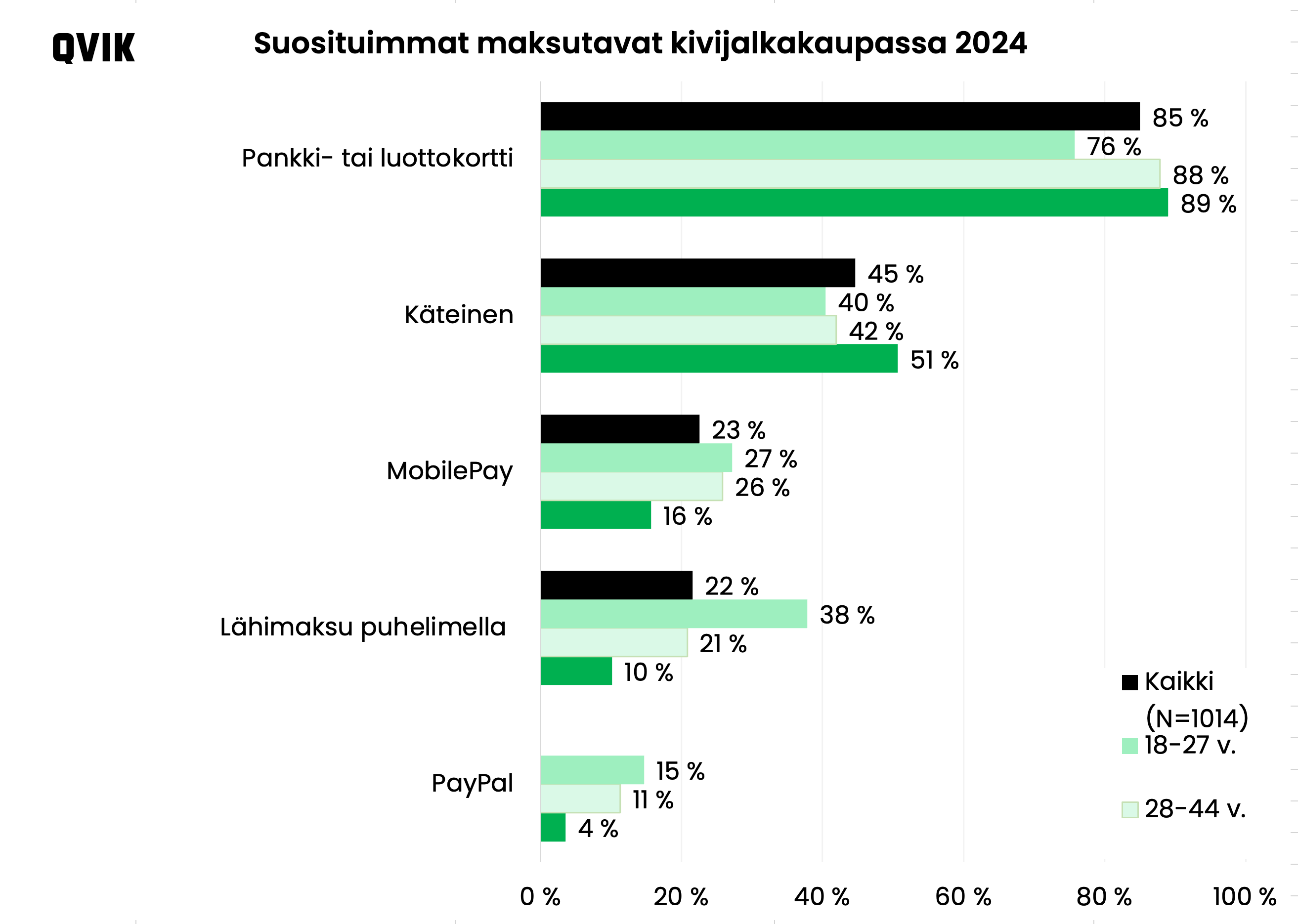 Korttimaksujen suosio Suomessa on edelleen ehdoton, yli kolme neljäsosaa suosii kortteja. Käteinen on kakkonen, mutta selvä sellainen, ainoastaan alle 28-vuotiaiden mieltymys lähimaksamiseen puhelimella – eli käytännössä vaihtoehtoon korttimaksuille – kilpailee käteisen kanssa.