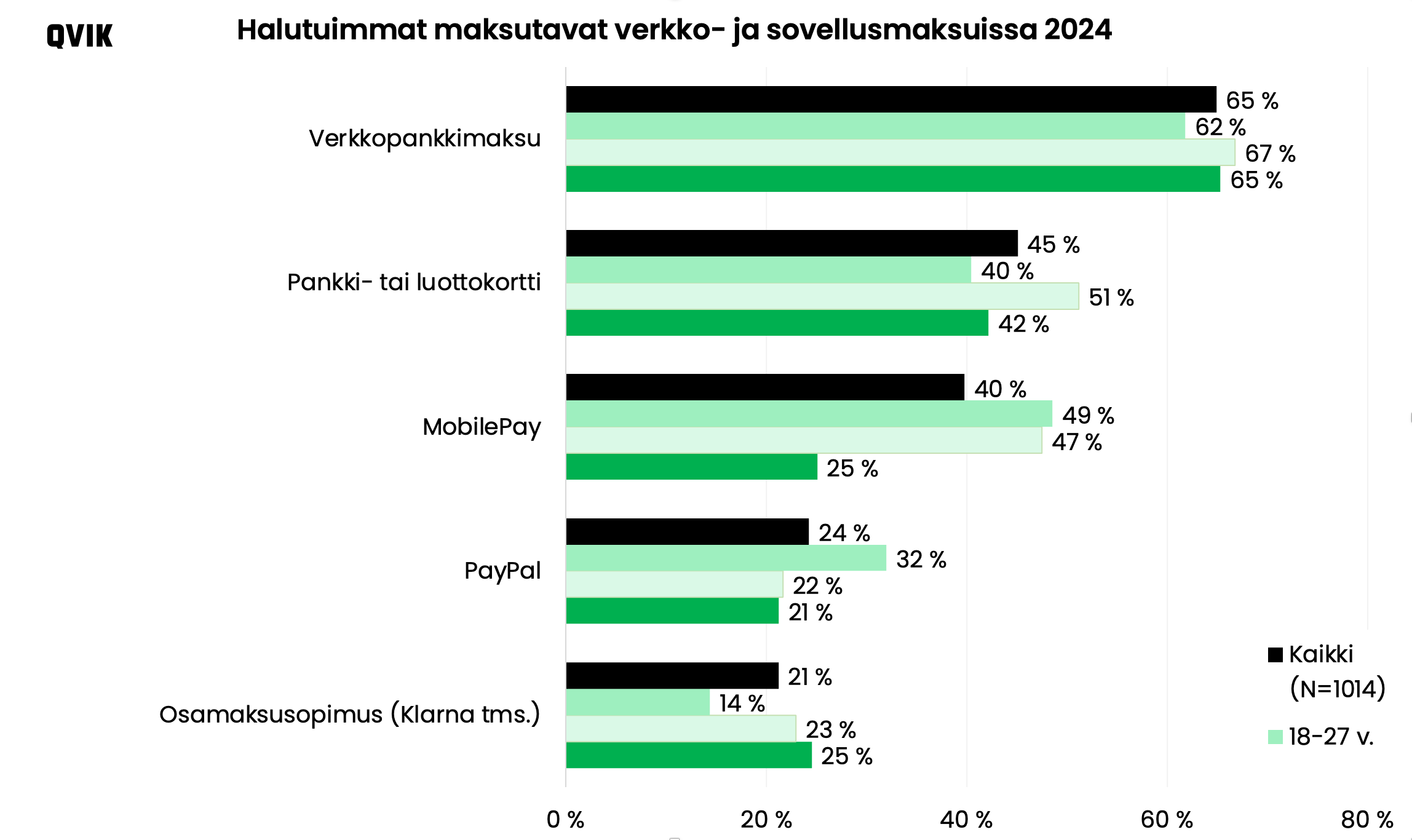 Suomessa on pitkään vallinnut omalaatuinen verkkomaksumaailma ja se ei vieläkään ole mullistunut – täysin. Verkkopankki jatkaa suosituimpana maksutapana, mutta MobilePay on kirinyt hyvin lähelle korttimaksuja.